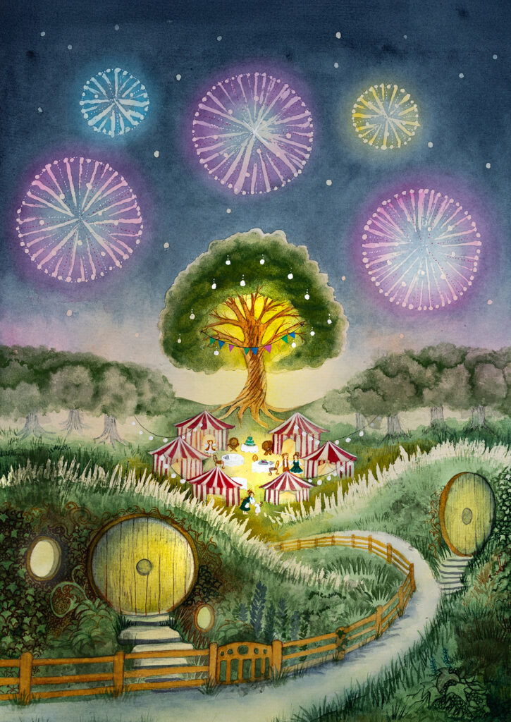 Fine art giclée print of a watercolour painting depicting Bilbo’s eleventy-first birthday in Hobbiton. Part of my Lord of the Rings painting collection