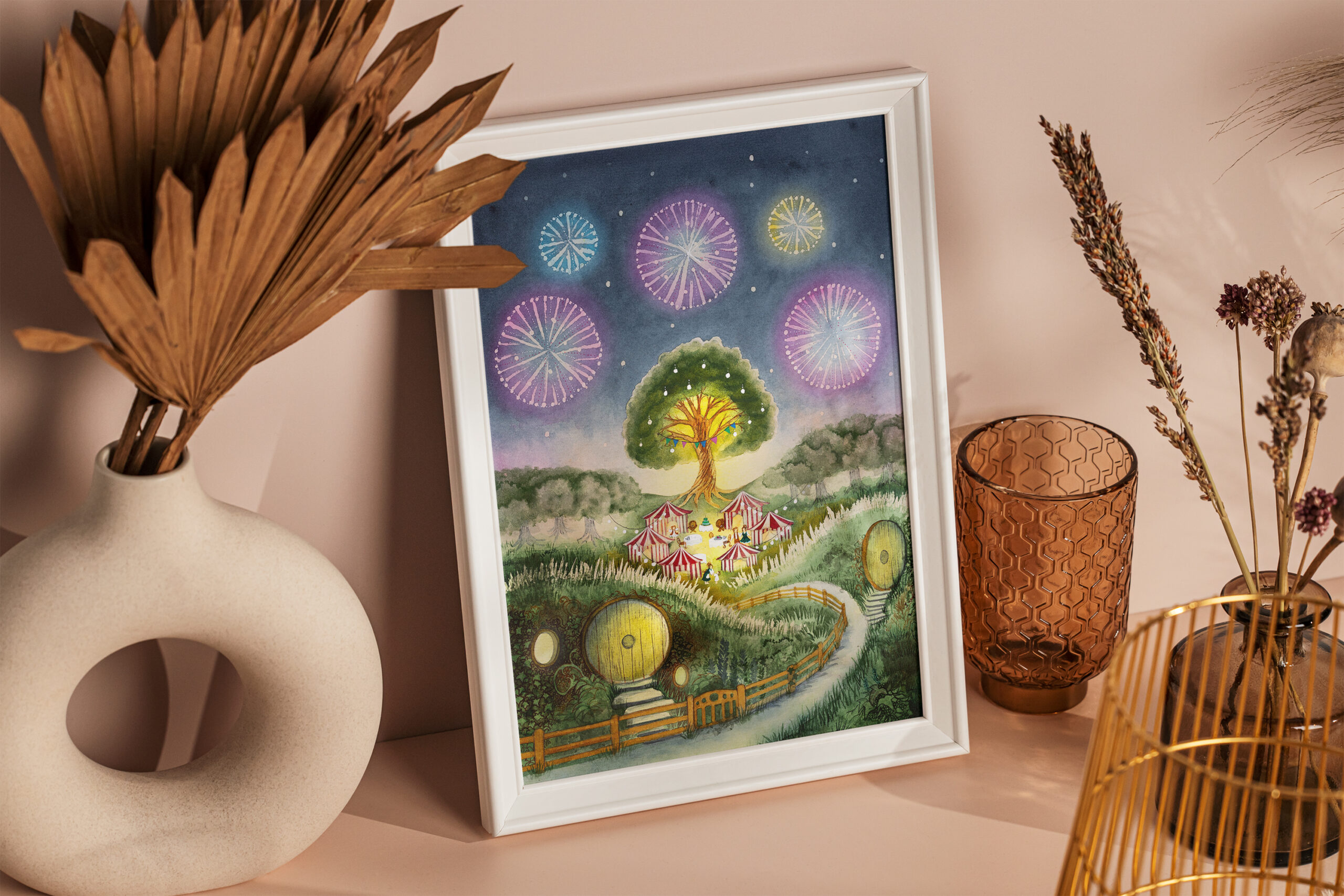 Fine art giclée print of a watercolour painting depicting Bilbo’s eleventy-first birthday in Hobbiton. Part of my Lord of the Rings painting collection